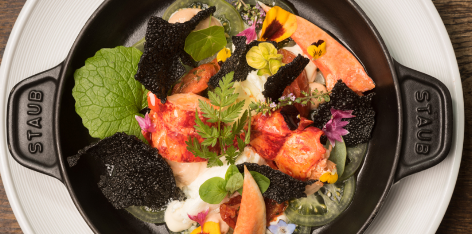 Try this Whitby Lobster with Cod Roe Pâté, Lowna Dairy Goat’s Curd and Squid Ink Crackers, Soft Herbs recipe from Andrew Pern.