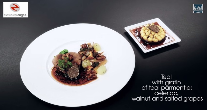 Teal with gratin of teal parmentier, celeriac, walnut and salted grapes