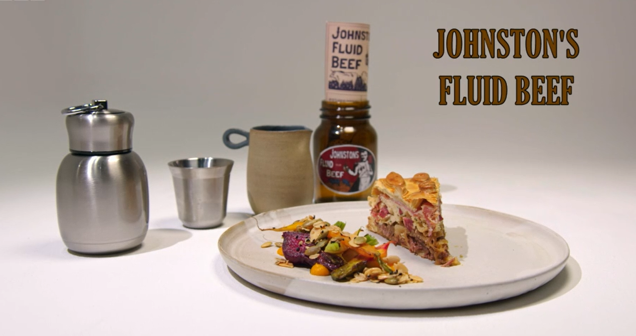 Roberta's show-stopping main course, 'Johnston's fluid beef' was a nod to two Scottish inventions: Bovril and the Thermos. It featured a beef cheek and shin pie layered with ox tongue-studded chicken mousse and caramelised onions, wrapped in parma ham and shortcrust pastry, served with a red wine sauce, topped with baby vegetables and an oat seed mix. A jug of beef consommé was also placed on the table for guests to drink from Thermos cups.