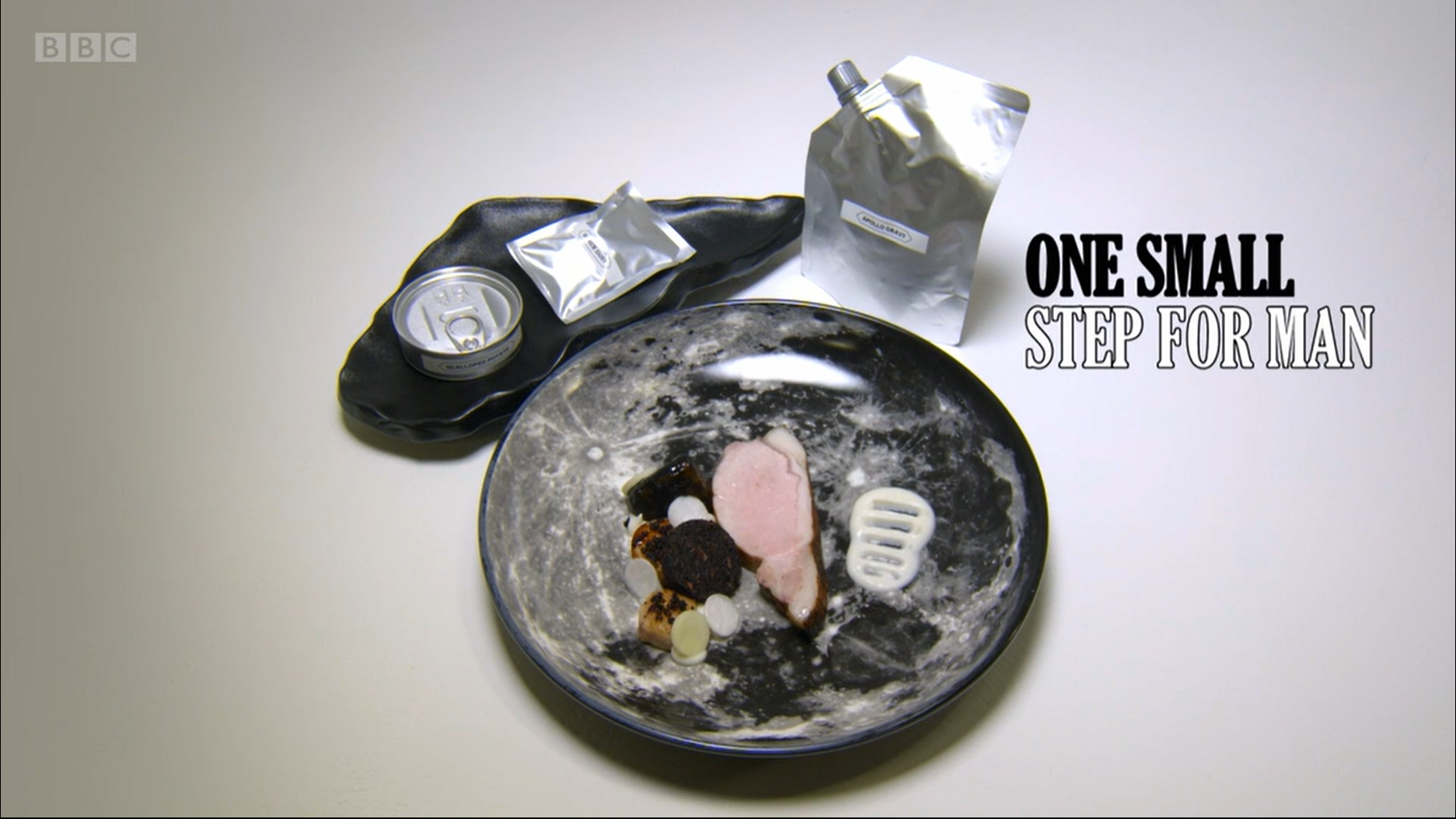 Sally's black and white main course, 'One Small Step for Man' was inspired by the BBC broadcast of the moon landing on July 20th, 1969, and one of the Apollo astronauts' meals when on board the Lunar Module. Having scored 10/10 from veteran judge Aktar Islam, Sally attempted to recreate the dish identically for Tom, Nisha, Ed and Cat.