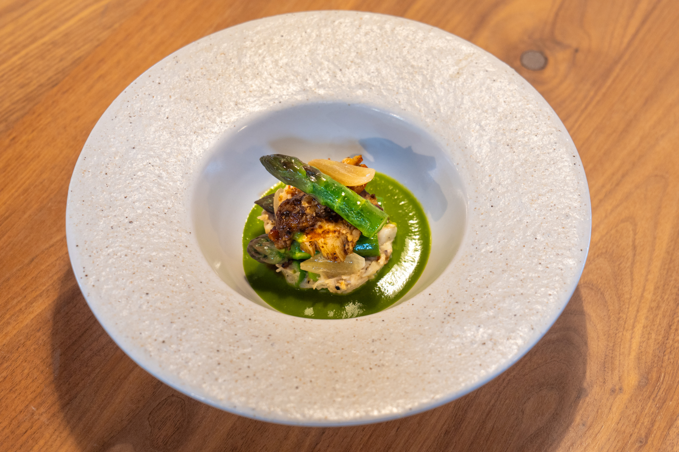 Warm salad of Portland crab, xo, New Forest asparagus, crab pickled onions