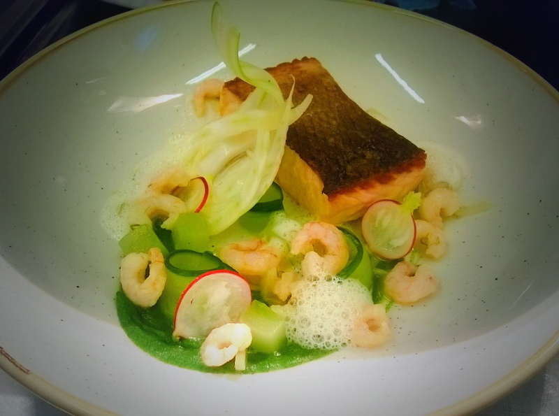 pan fried salmon, cucumber, prawns, fennel
