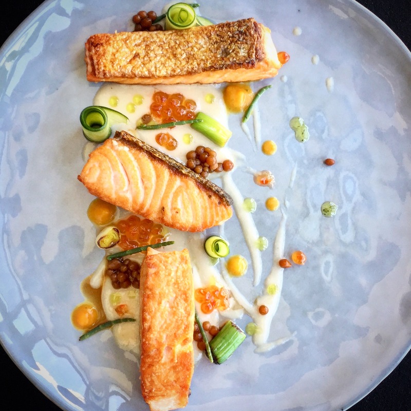 Grilled Salmon | orange puree | wasabi infusion | marinated cucumber | marinated...