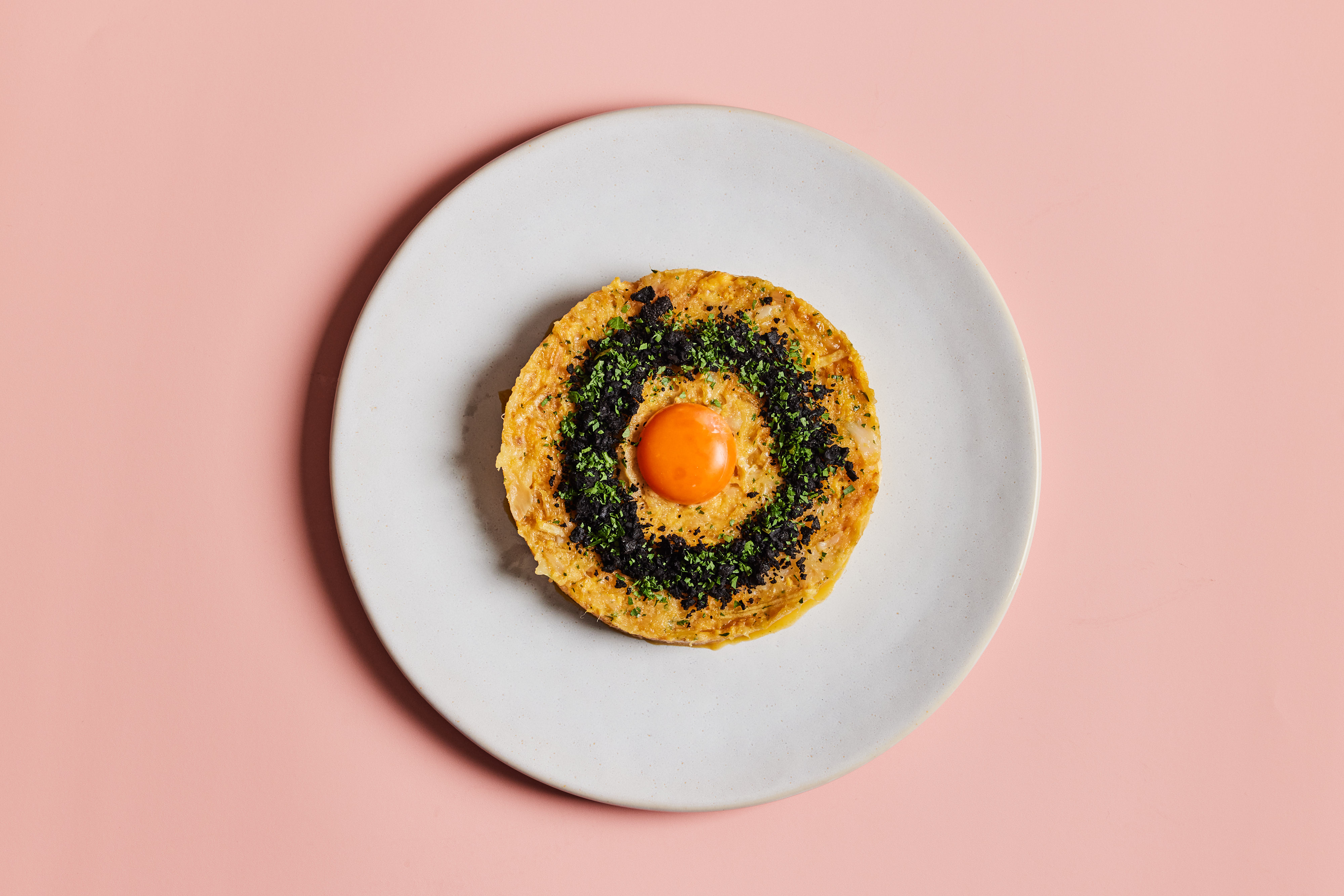 Plate the mix using a 120 mm ring and finish with a warmed egg yolk in olive oil, add chopped parsley and chopped dried black olives around the egg yolk.