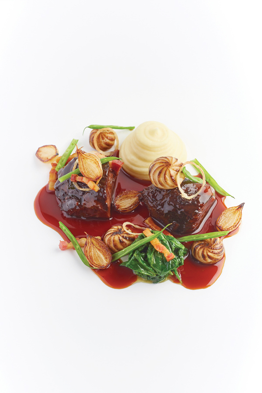 Braised Beef Cheek in Red Wine with Horseradish Mash, Mushrooms, Onions, Lardons recipe...