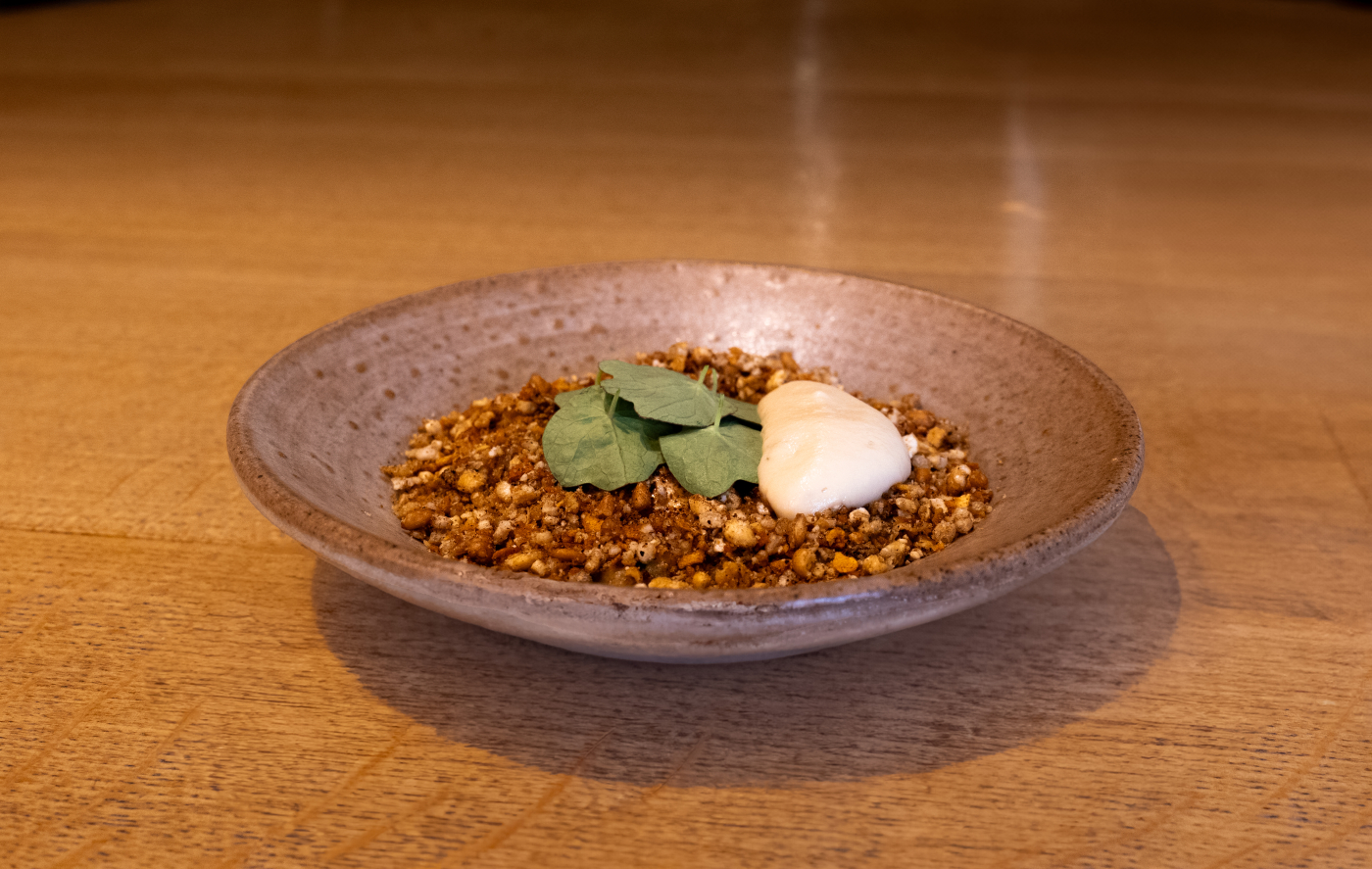 - Pinenut and lemon thyme crusted chicken breast with Kikkoman soy marinated onions and griolles
