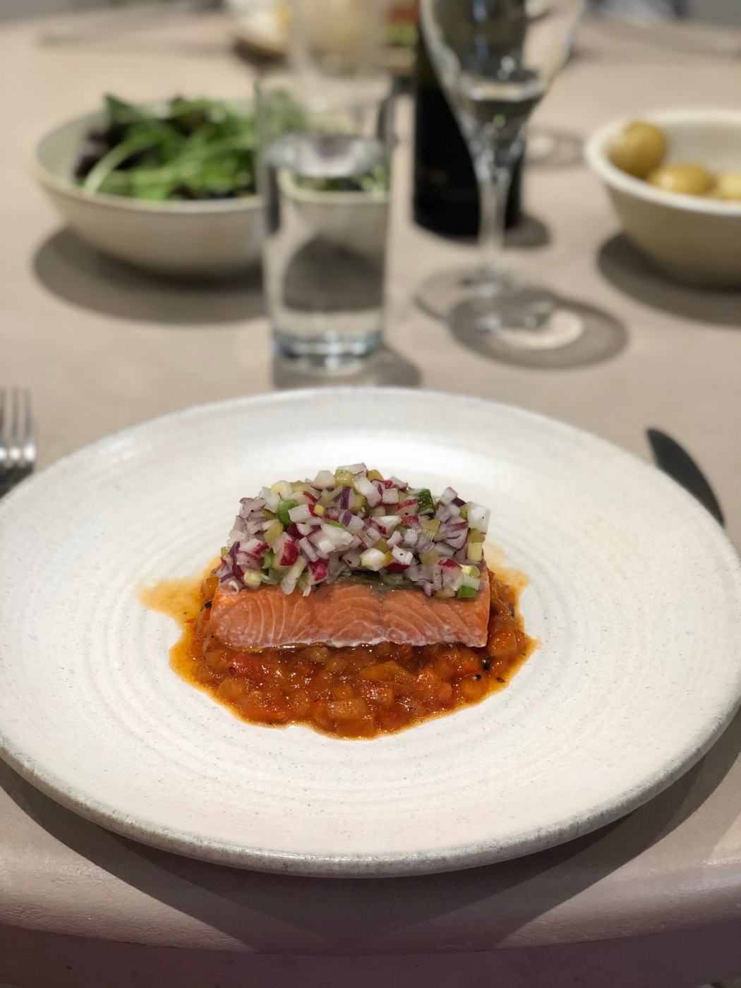 - Wild salmon fillet, wilted Southport samphire, garlic sautéed langoustines, Blackpool tomato caviar