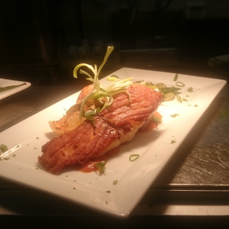 Pan fried salmon with an asian broth