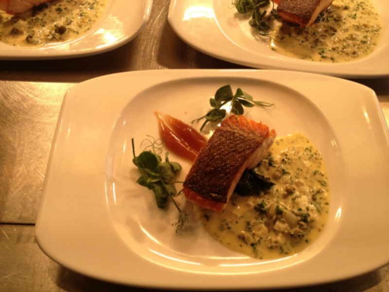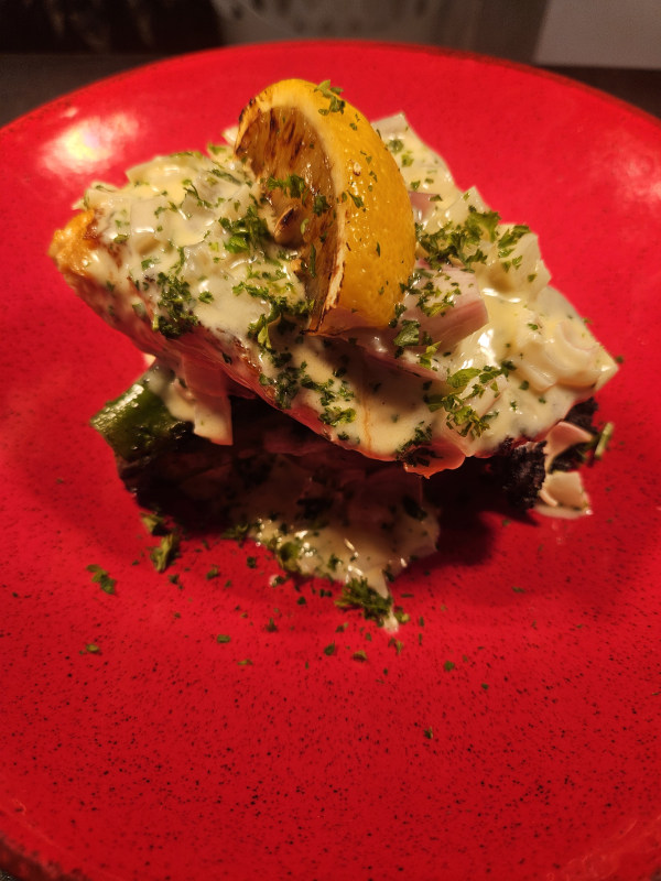 Pan fried salmon, fondant potato, pan fried tenderstem, lemon, shallot and parsley sauce