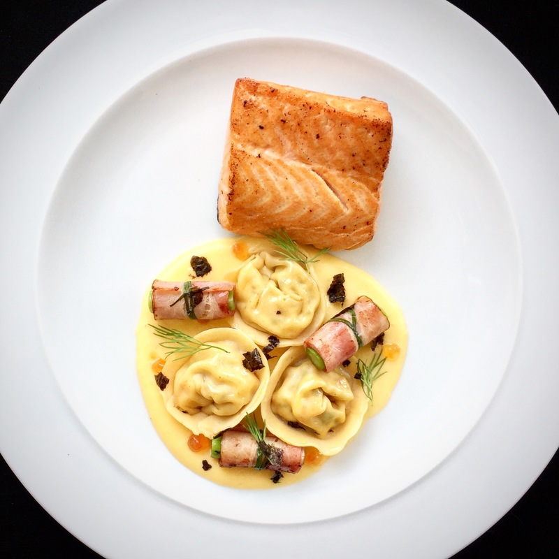 Grilled Salmon | prawn and hazelnut tortellini | hollandaise sauce | crispy nori | ...