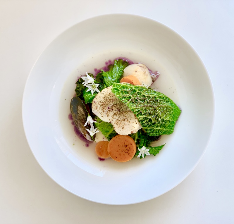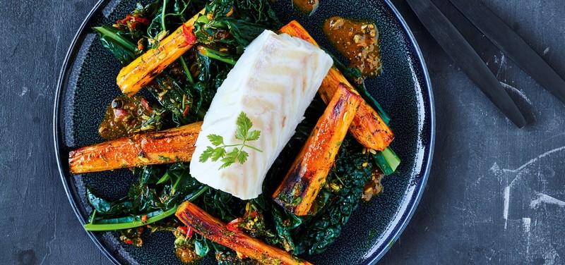 Steamed cod on palm cabbage and baked salsify roots