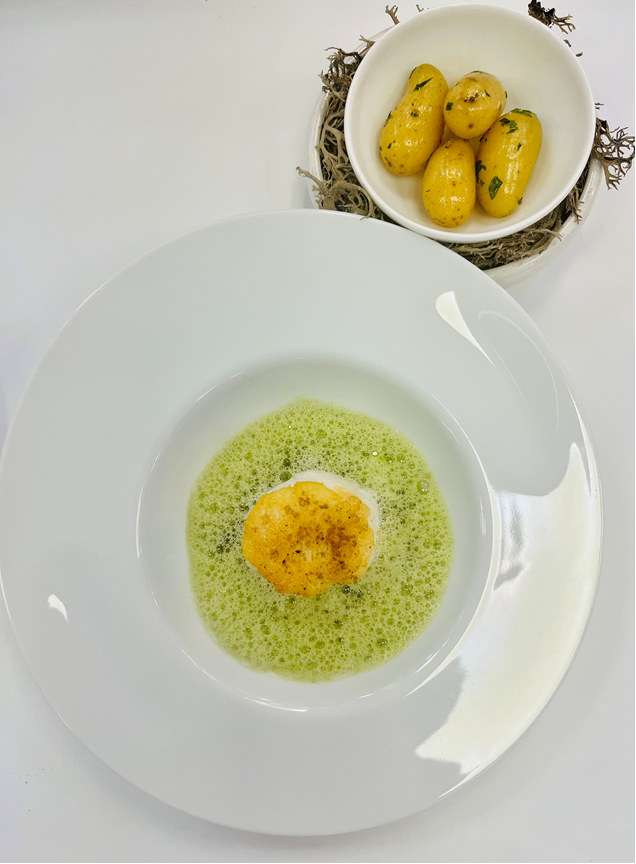Seal the cod off and cook in a little emulsion, spoon the peas on the bottom of the plate, then the dressed baby gem on top. Spoon over the baby gem sauce and finish with the cod. Serve the jersey royals on the side.