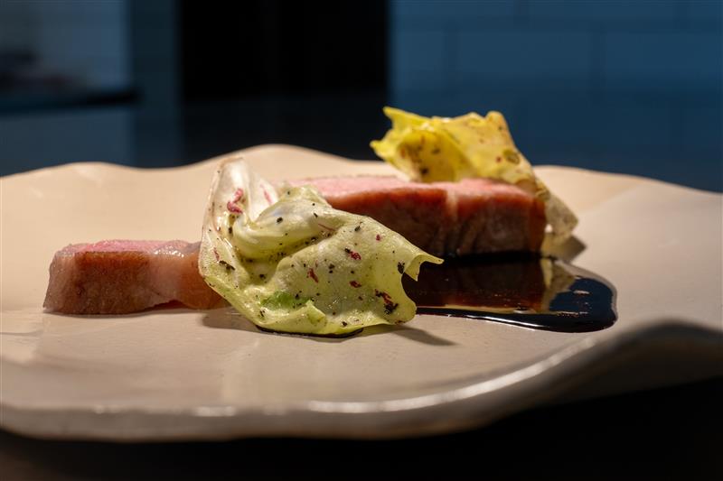 Woodland pork cooked over coals with radicchio dressed in earl grey and sauce black pudding